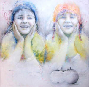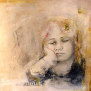 Kinderportretten in diverse techniek en materiaal op paneel.